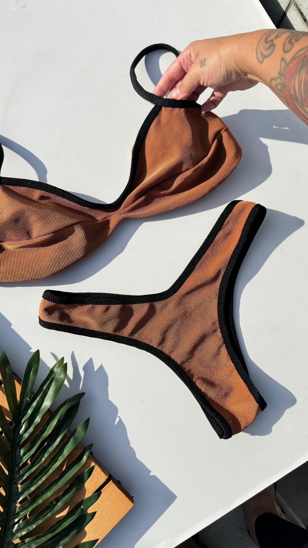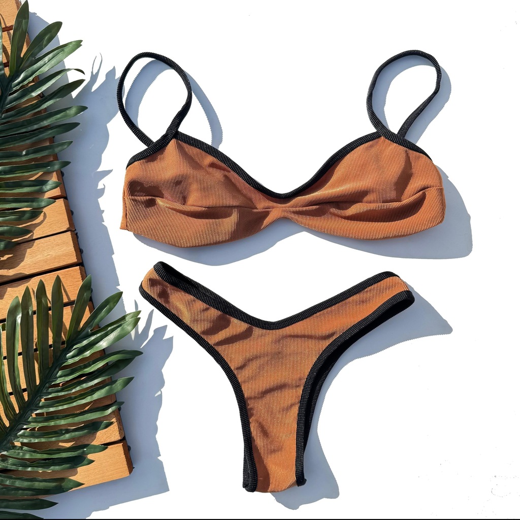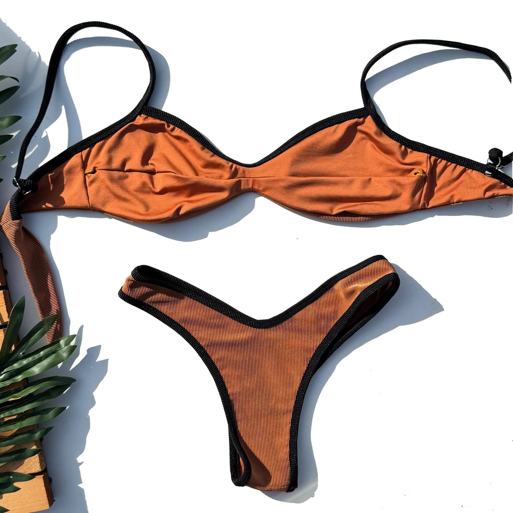 Sinta-se confortável e elegante com o Biquíni Andressa Suita Calcinha Viés na sofisticada combinação de caramelo com preto. Este modelo foi desenvolvido para quem valoriza conforto sem abrir mão do estilo.