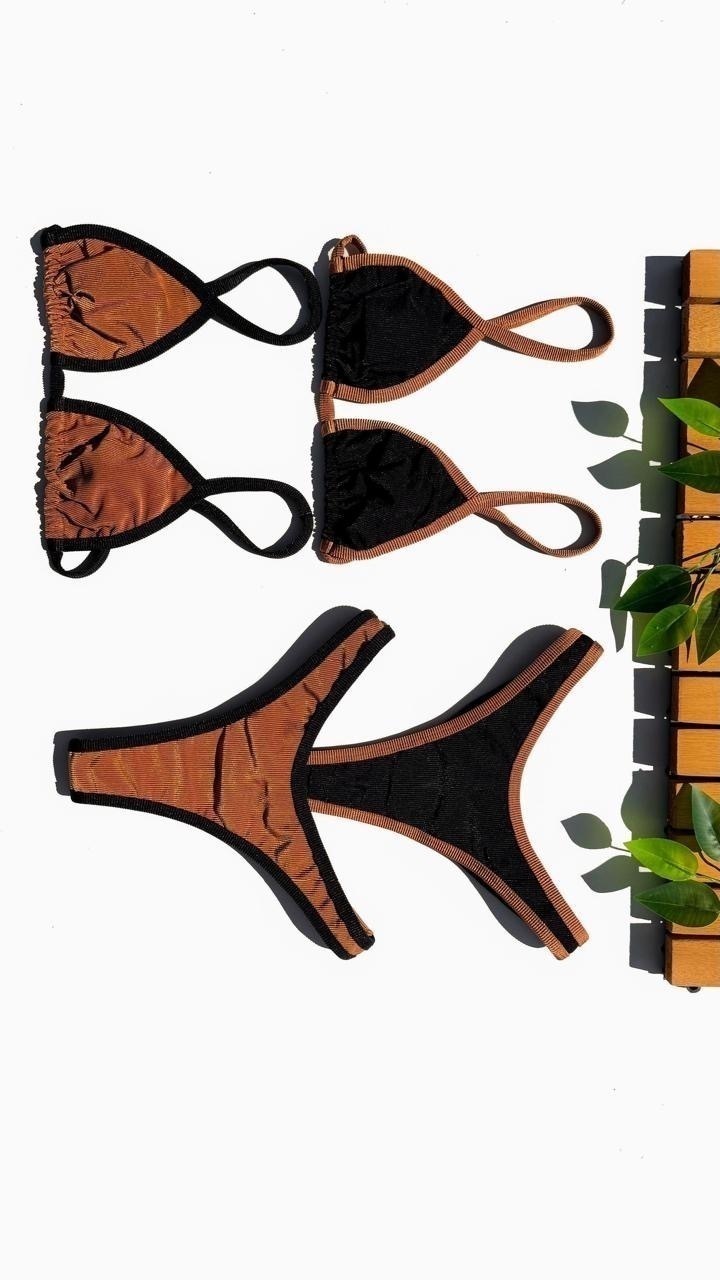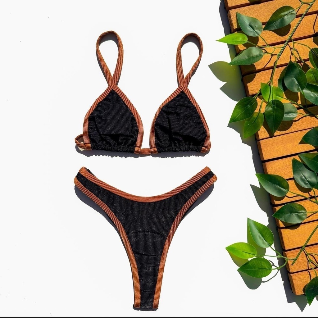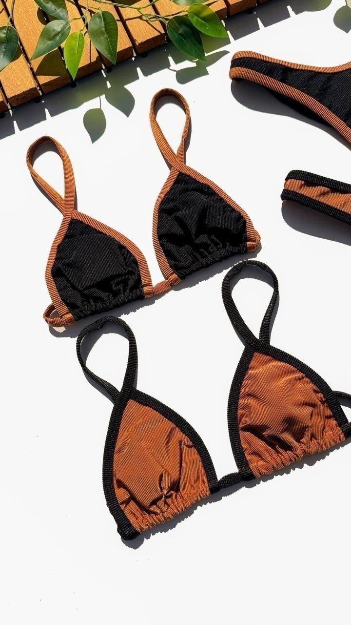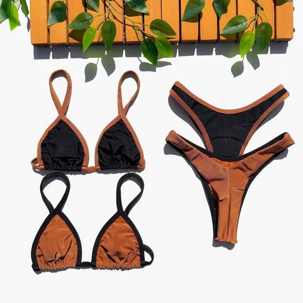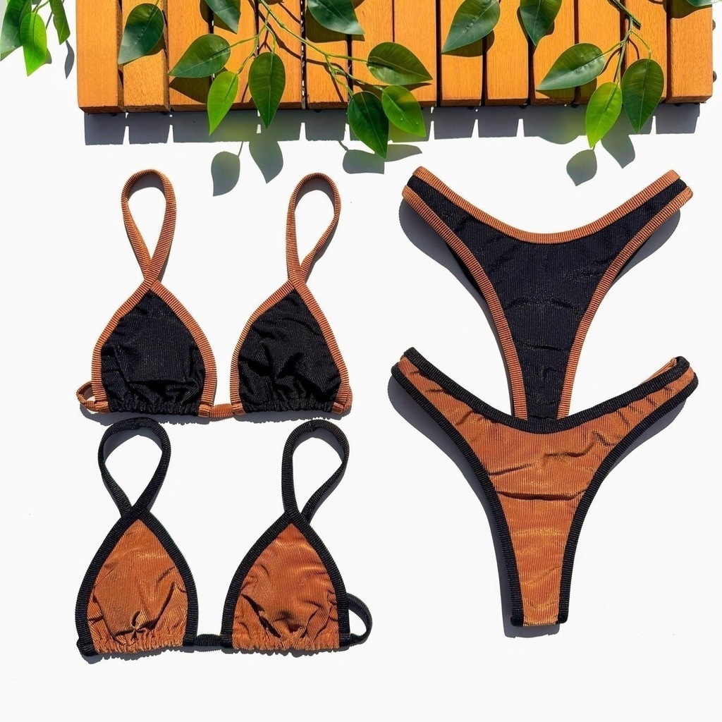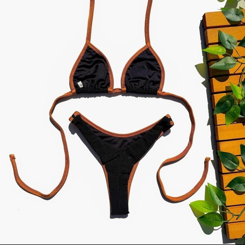 Garanta já o seu Biquíni Cortininha Calcinha Asa Delta - Preto com Caramelo e sinta-se confiante, elegante e confortável durante todo o verão!