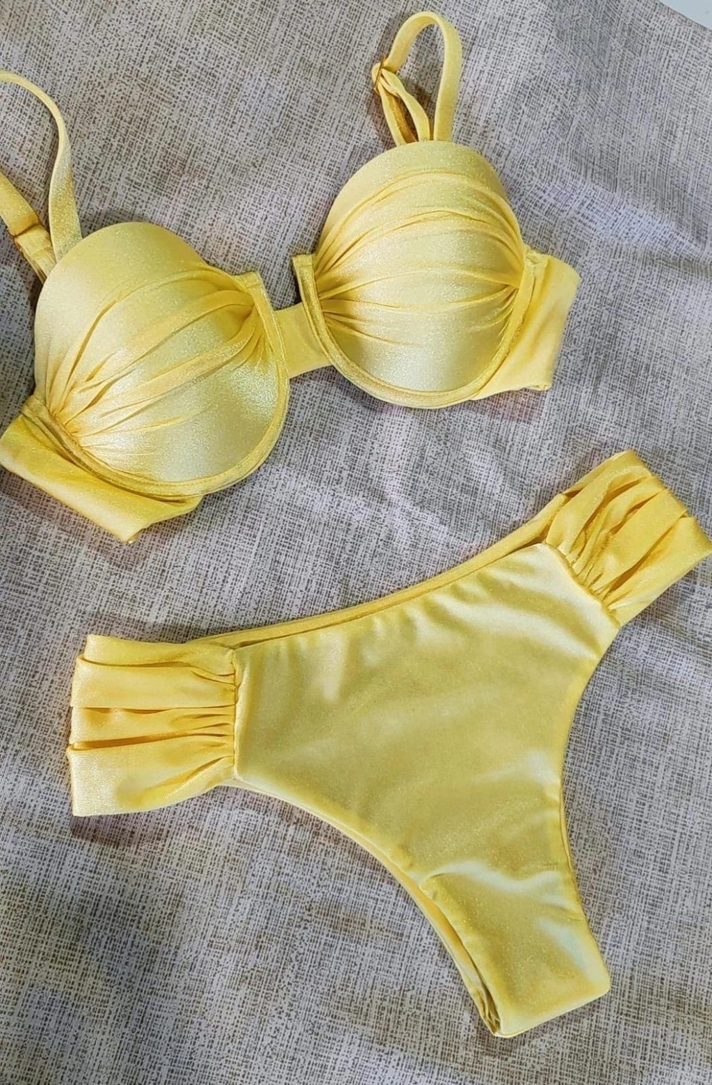 Descubra o poder do BIQ Reforço Calc Bombom - Amarelo Manteiga, um biquíni pensado para mulheres que buscam beleza, segurança e praticidade em uma única peça.