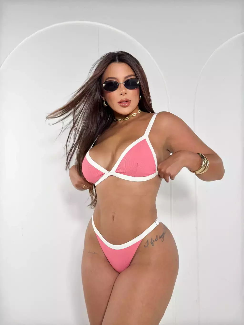 Sinta-se deslumbrante e confiante com o Biquíni Triângulo Sem Bojo com Regulagem nas cores rosa e off. Ideal para quem adora fazer marquinhas no sol, este biquíni traz um estilo irresistível e moderno.
